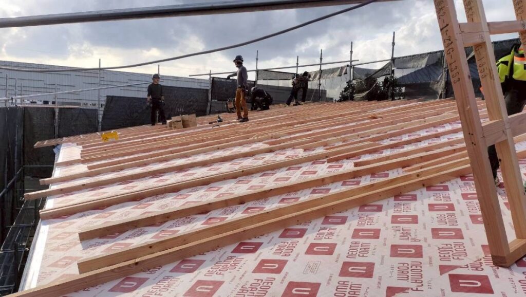 基礎しかなかった土地に、1日で家の形が立ち上がる様子はいつもながら圧巻です。