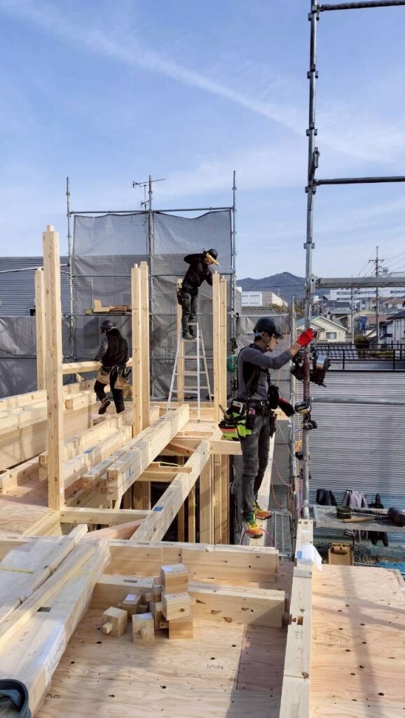 春日井市高森台の現場では、すでに建て方大工の方々の作業が始まっていました。