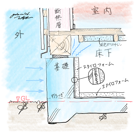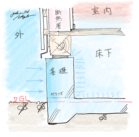 ですから床下であろうとコンクリートを伝導し温めて、あるいは冷やしてしまい、1階の床から室内の温度を対流によって奪ってしまうのです。