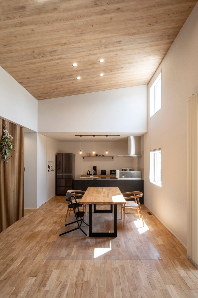 高さのある勾配天井が、空間にとにかく“ゆとり”をつくります。