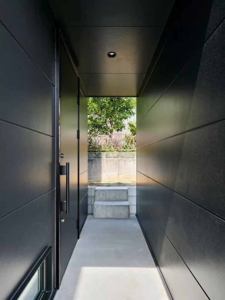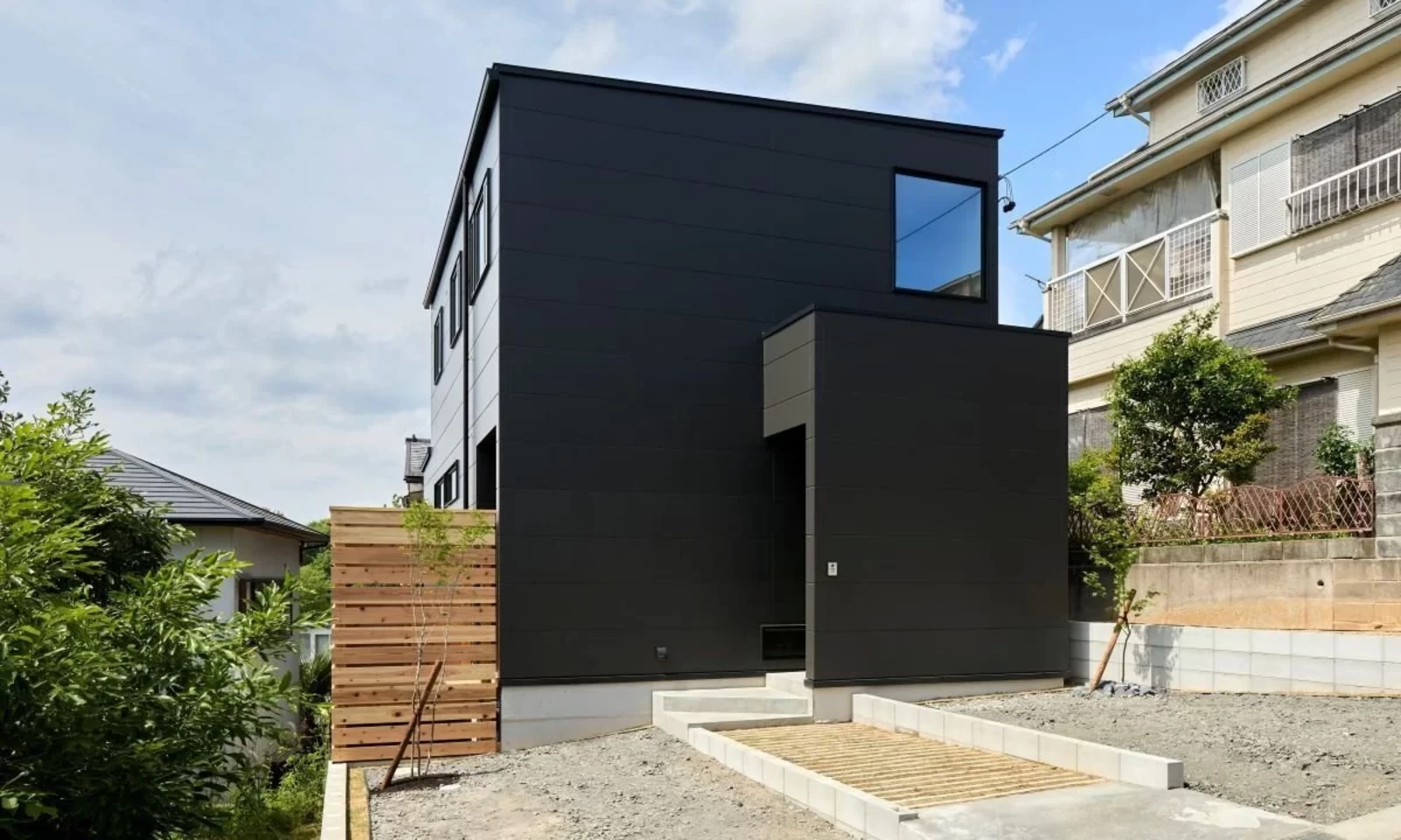 青空に映えるブラックの外観と、安心のアプローチ設計