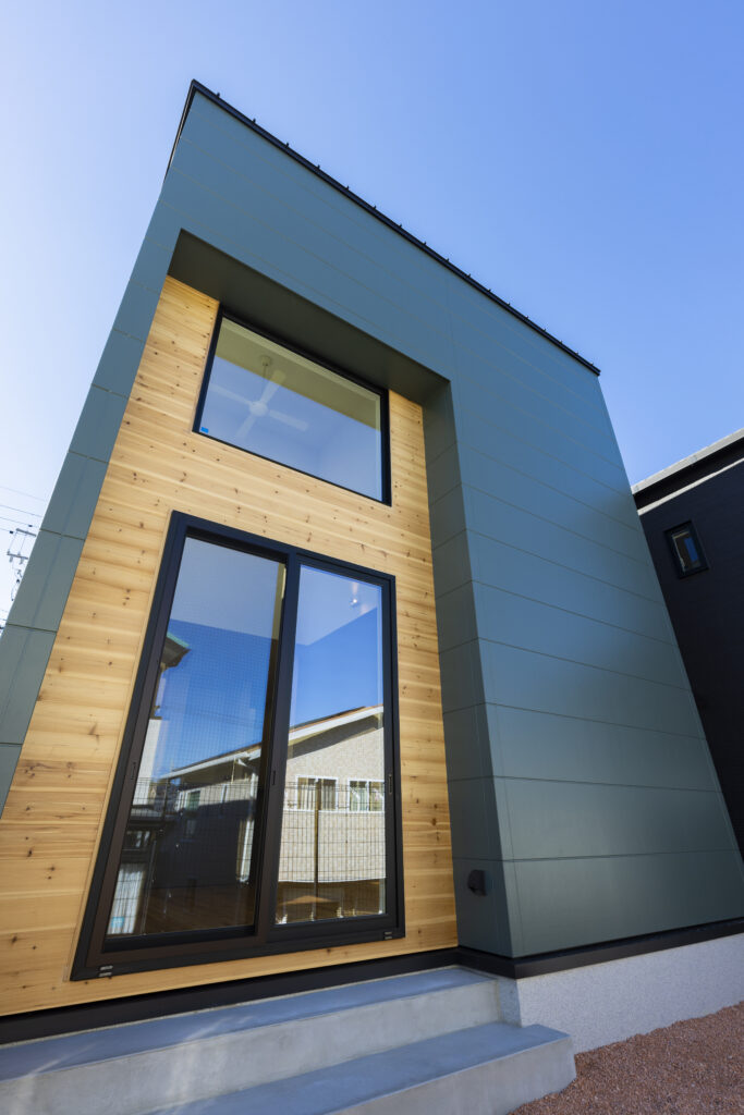 シックなグリーンの外壁に、斜めに配置された木目の玄関が映えるスタイリッシュな外観。