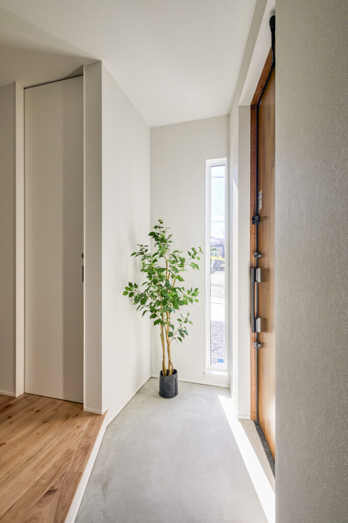 玄関に入ると、スリット窓からやさしい光が射し込む明るい空間がお出迎え。