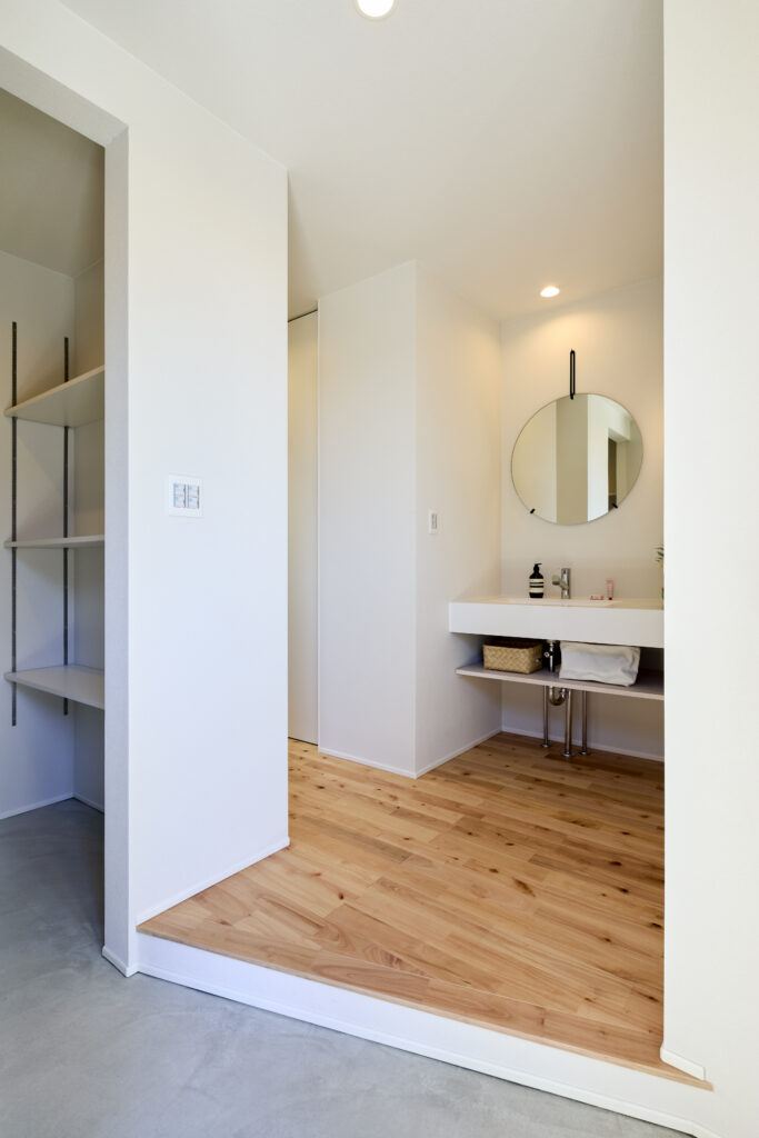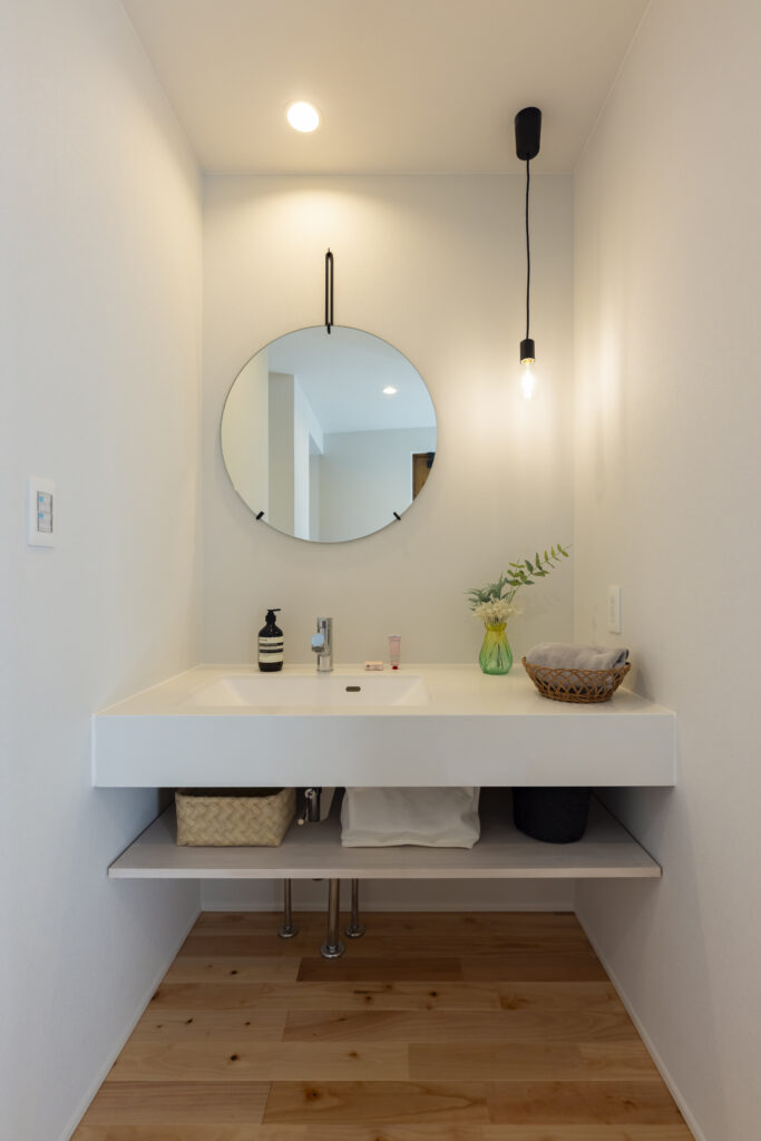 お施主様が家づくりの初期からイメージされていた、丸い鏡とスタイリッシュな洗面。