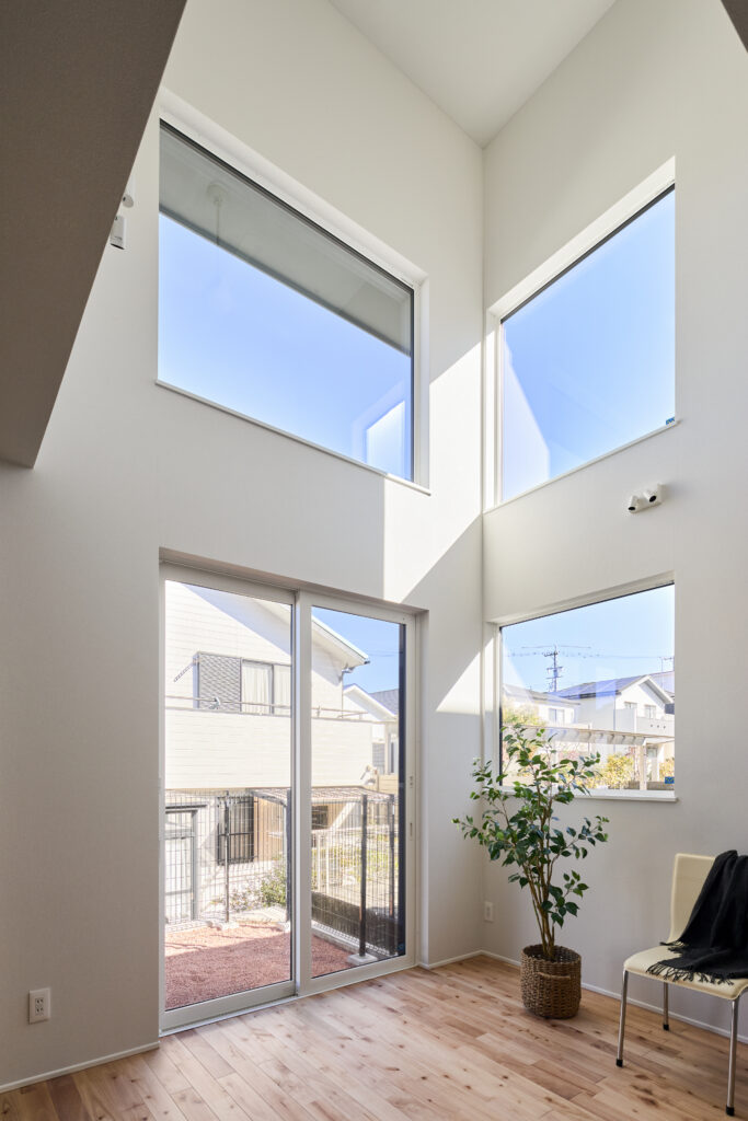 吹き抜けの大きな窓から光が差し込み、一日中明るく心地よい空間が広がります。