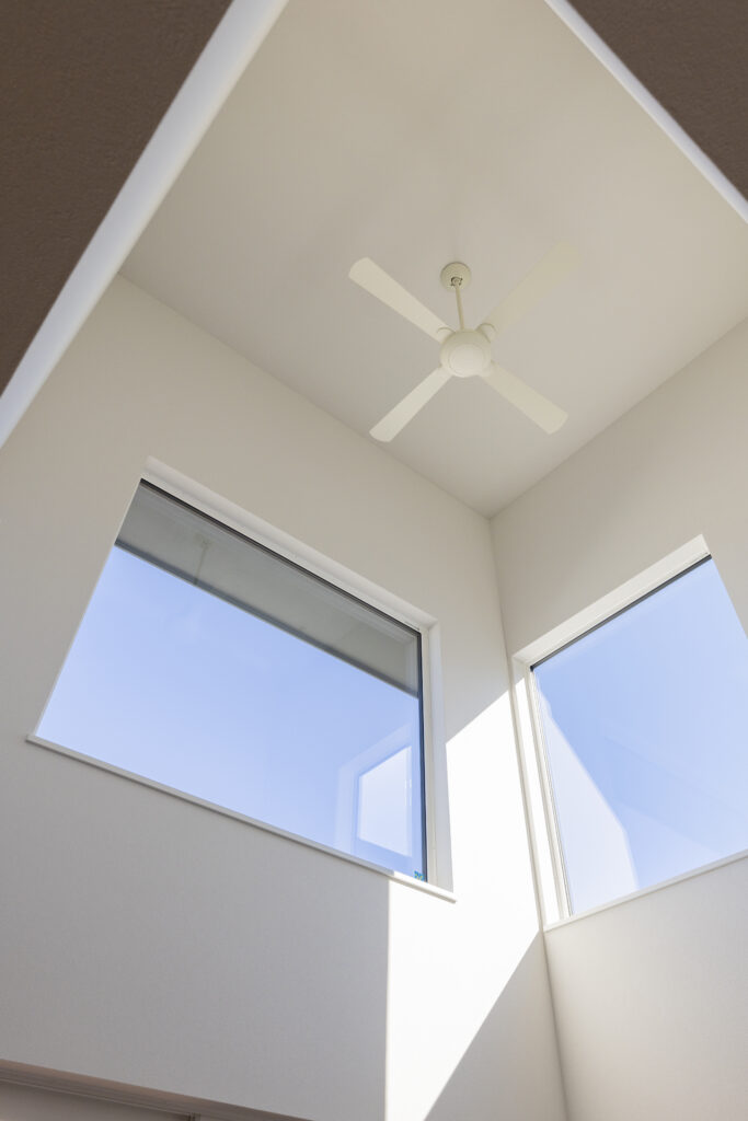天井のシーリングファンはデザイン性だけでなく、吹き抜けにこもりやすい空気を循環させる実用的なアイテム。