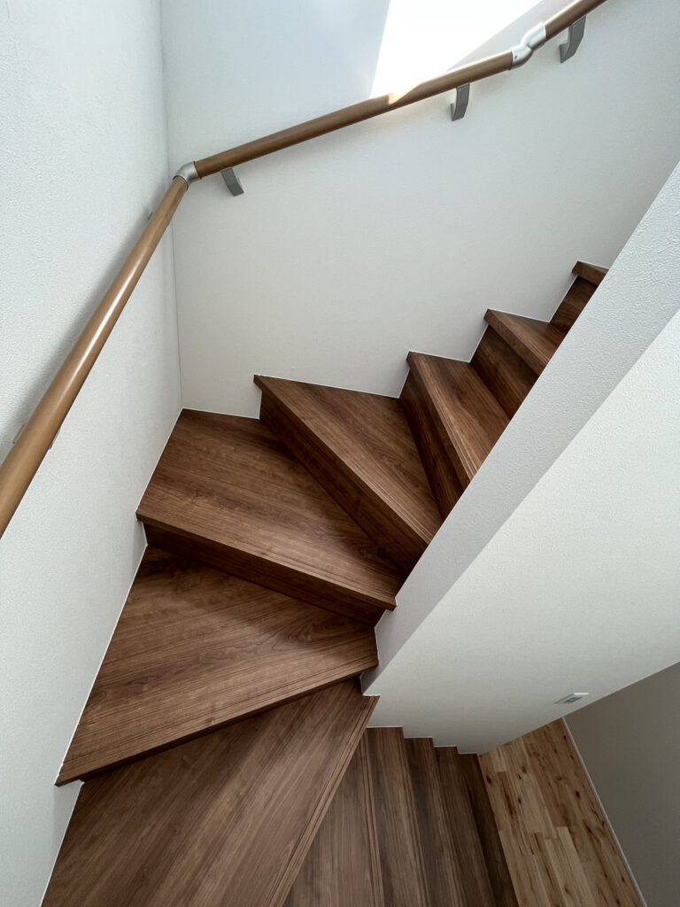 まわり階段の下に扉付きの収納を設け、デッドスペースを有効活用。
