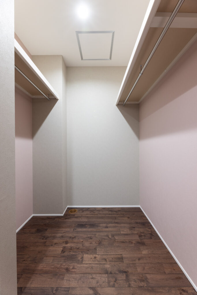 たっぷり収納できるウォークインクローゼットは、洋服を掛けたときに少しだけピンクの壁がのぞくデザイン。