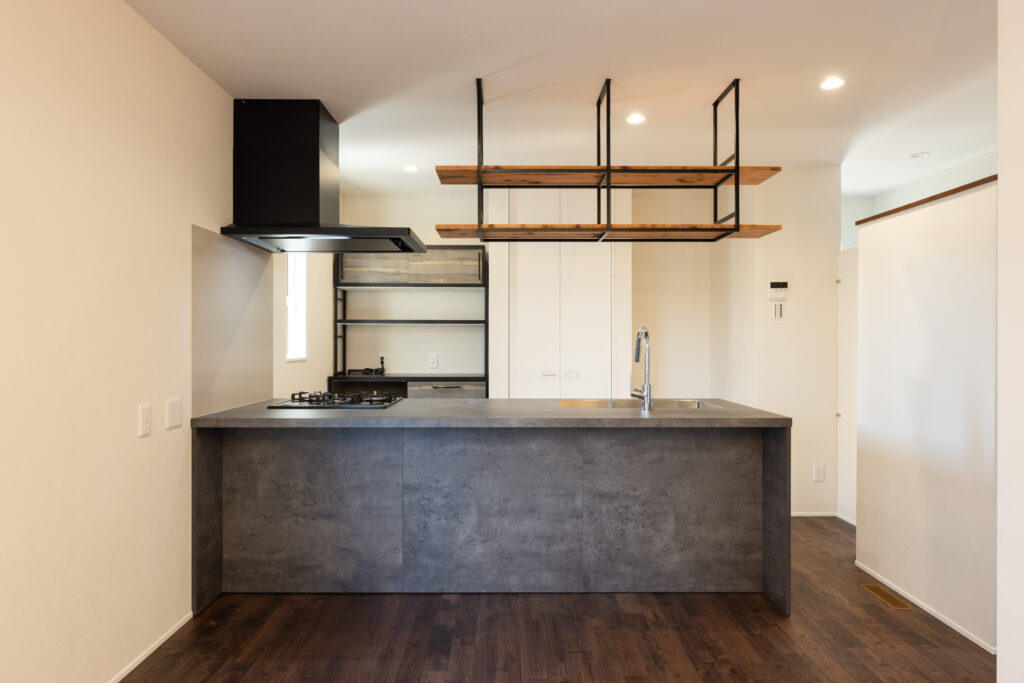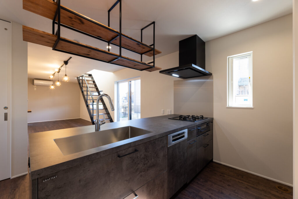 カフェバーのように楽しめる、吊棚付きのこだわりキッチン