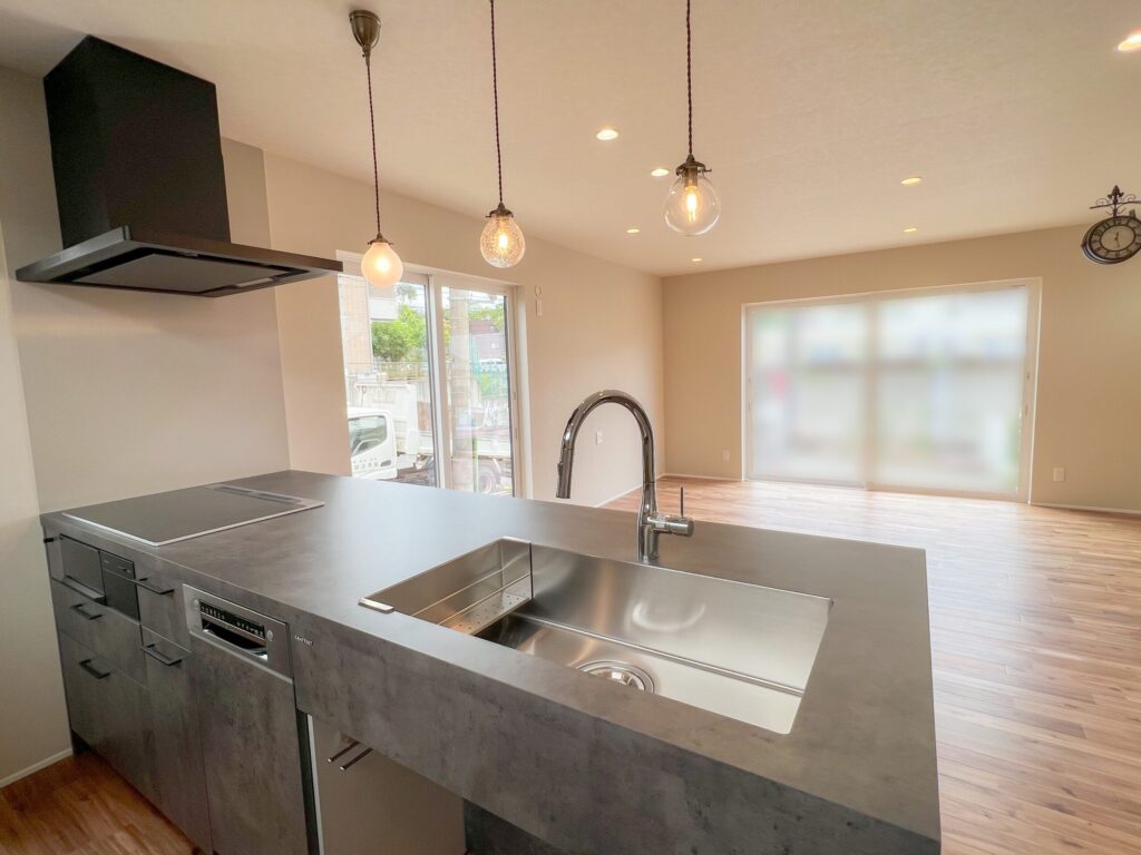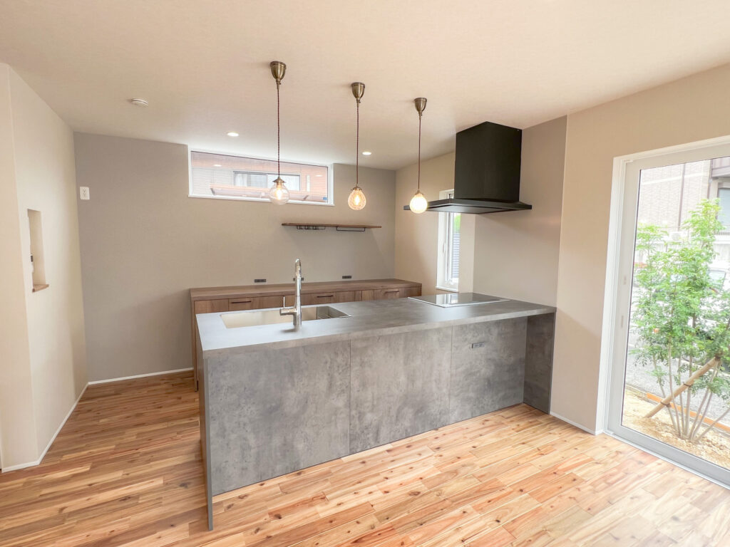 グレー×木目が映える、開放感あふれるキッチンとリビング