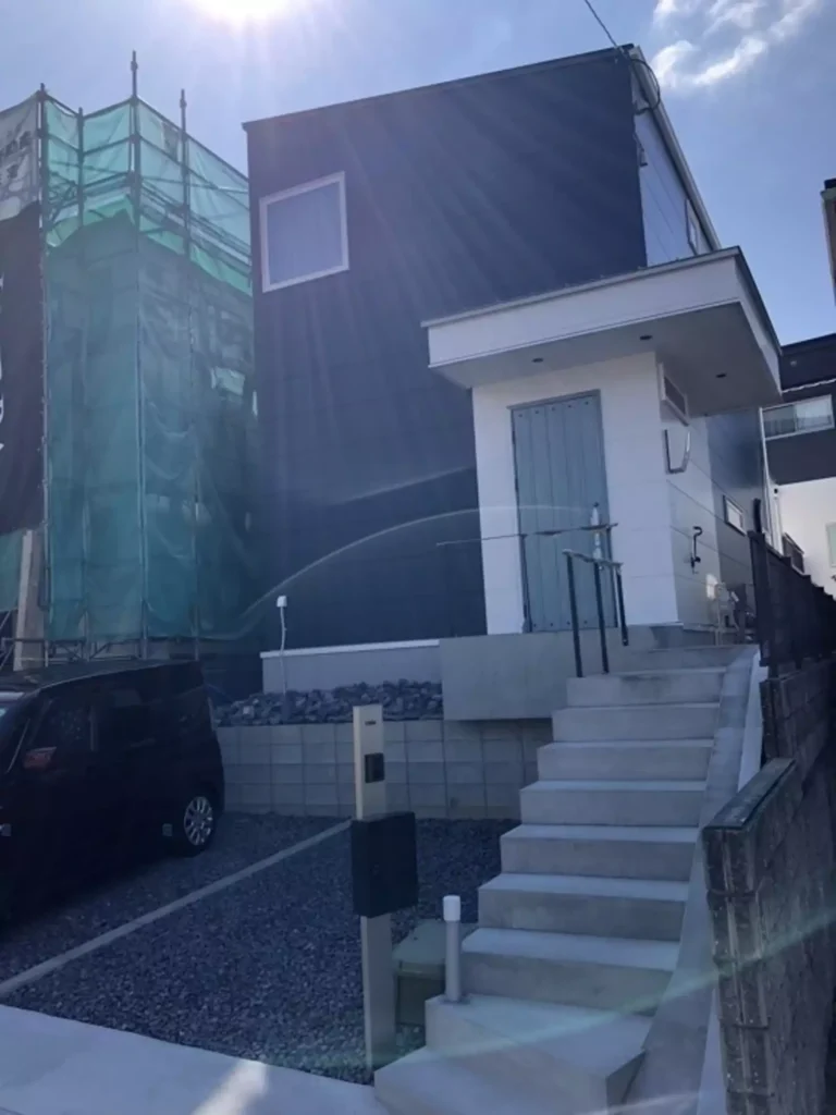 アイスブルーノーチェの玄関ドアがアクセントとなり、上品で印象的な佇まいに。