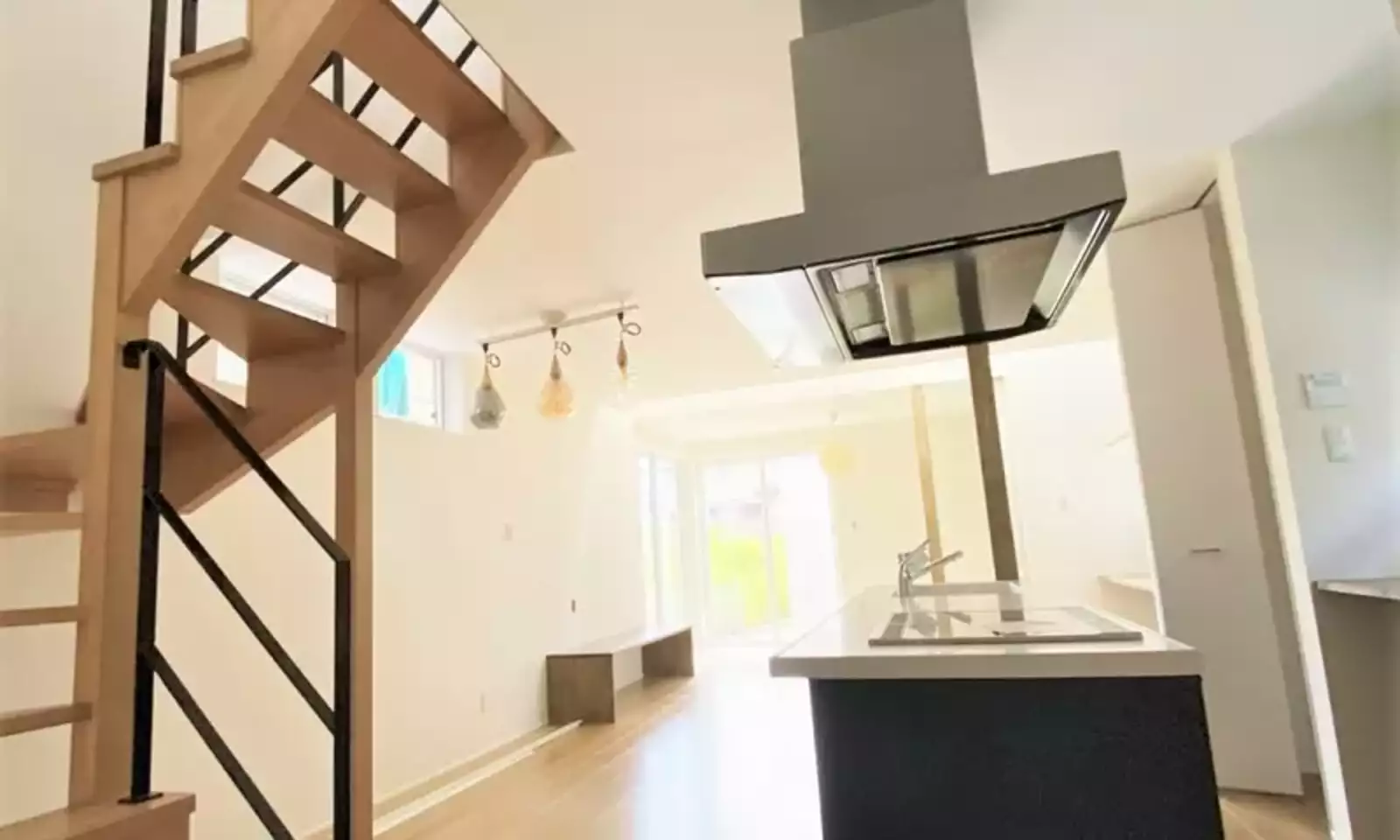 スケルトン仕様の回り階段は、視線を遮らず開放感を保ちながら、